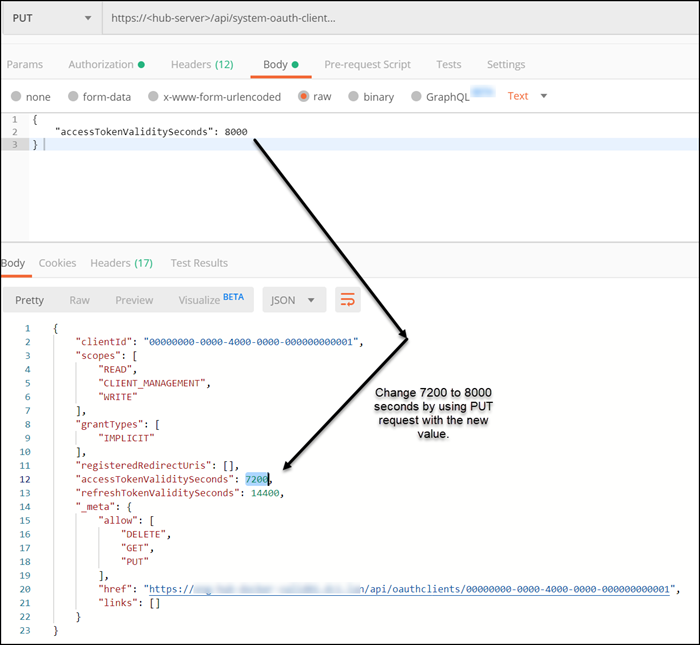 Note: Users must have permission to update the OAuth Client to use the PUT method for this task. The system administrator role includes the required permissions.The value that you type in the PUT request body is the new timeout value.