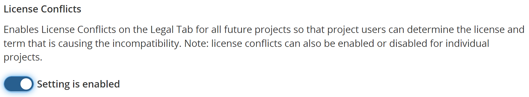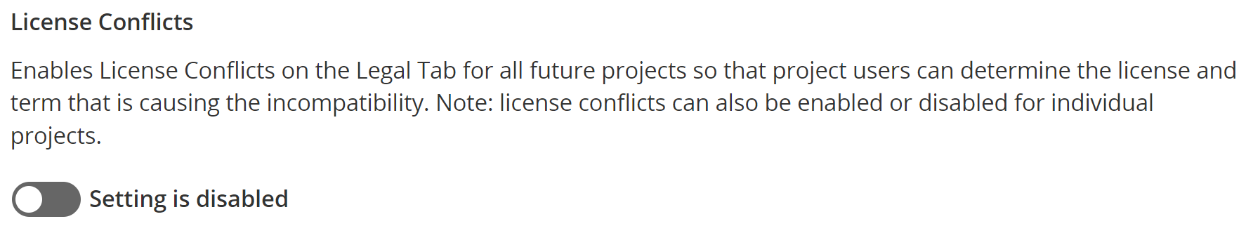 Set the toggle located in the License Conflicts section to Setting is enabled to display the Legal and License Conflicts tabs. Enabling the setting will not take effect immediately for existing projects.